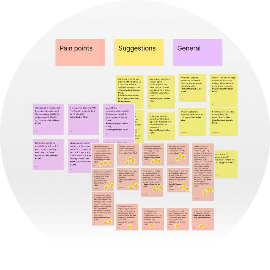 To understand the current challenges faced by users and to learn more about their expectations, we conducted one-on-one remote interviews and usability testing with real users, specifically the bank personnel. Accessing real users in B2B environments was challenging due to security concerns. Despite the obstacles, I managed to secure users’ time and participation in the research. The exercise yielded a plethora of new findings, that were a surprise to both business and clients.